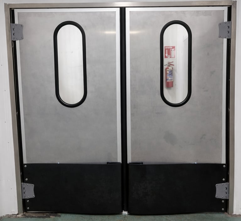 Our semi-insulated traffic doors are built for busy operational environments where reliability is critical. Featuring a heavy-duty bi-directional hinge for seamless two-way movement, they are perfect for separating high-traffic work areas such as food processing plants, commercial kitchens, supermarkets, healthcare facilities, and hospitality spaces.